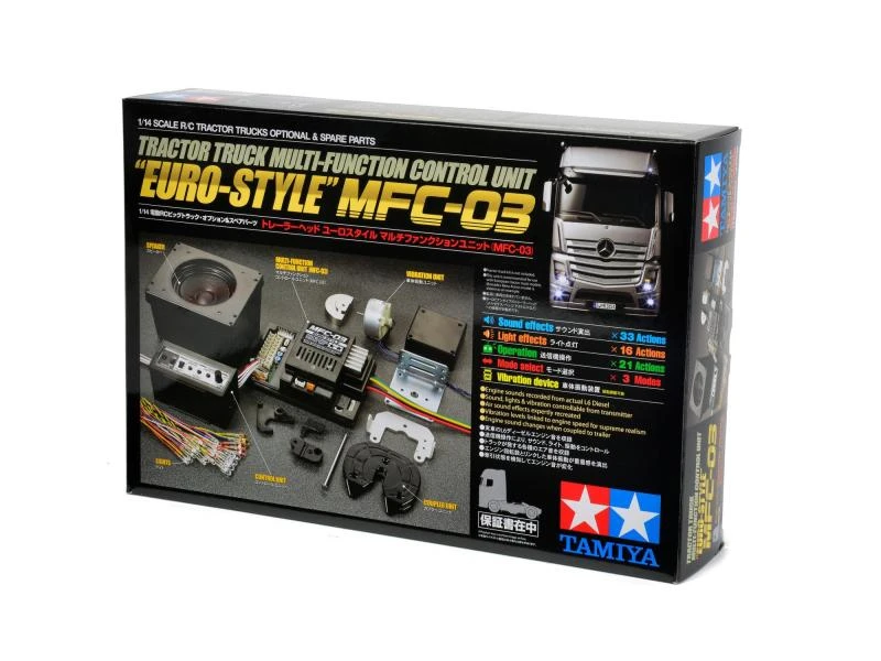 Mit der Multifunktionseinheit MFC-03 Euro-Style von Tamiya simulieren Ihre LKW-Modelle nahezu alle Sound- und Lichtfunktionen ihres grossen Vorbilds. Sie ergänzt mit dem an einem europäischen Reihensechszylinder-Dieselmotor aufgenommen Sound perfekt Modelle wie den MAN TGX, Mercedes Benz Actros, Scania R470 und weitere.
